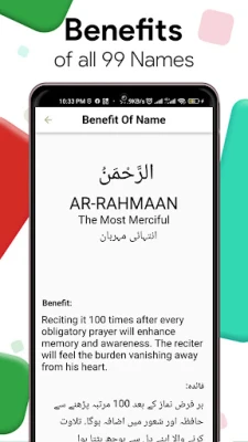 Ndani ya "Beautiful 99 ALLAH Names", utapata fursa ya kipekee ya kusoma na kusikiliza kila jina la Mwenyezi Mungu. Kila jina limeandikwa kwa Kiarabu fasaha, likisindikizwa na matamshi sahihi ya sauti, kukusaidia kuboresha usomaji wako. Zaidi ya hayo, utafumbuliwa maana fupi za Kiingereza na maana za kina za Kiurdu kwa kila jina, zikikupa uelewa mpana wa sifa hizi tukufu. Kiolesura chake rahisi na cha kuvutia kimeundwa ili kurahisisha matumizi kwa kila Mwislamu popote pale duniani.