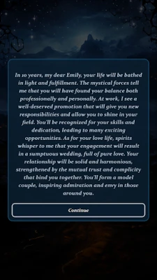 Fichua siri za hatima yako na "Psychic readings - Mystic Q&A," lango lako la kibinafsi la ulimwengu wa kiroho. Pata utabiri wa kibinafsi na majibu ya moja kwa moja kwa maswali muhimu kuhusu maisha yako ya baadaye.