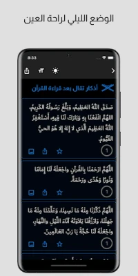 Kwa ajili ya usomaji wa usiku, programu inatoa hali ya usiku (night mode) inayopunguza mwangaza na kuwezesha kusoma kwa raha bila kuchosha macho. Pia una uhuru wa kubadilisha rangi ya mandhari ya programu ili kuendana na mapendeleo yako. Usikose kamwe muda wa ukumbusho na kipengele cha arifa kinachokukumbusha nyakati za adhkar. Jumuisha tasbihi yako ya dijitali yenye kihesabu maalum kwa kila dhikr na takwimu za jumla za ukumbusho wako. Zaidi ya hayo, programu ina مصحف القرآن الكريم kamili, أسماء الله الحسنى, صيغة التوبة, na ukurasa wa 'Adu'a Zangu' unaokupa nafasi ya kuongeza dua zako binafsi, ukifanya programu hii kuwa rafiki yako kamili katika safari yako ya kiroho.